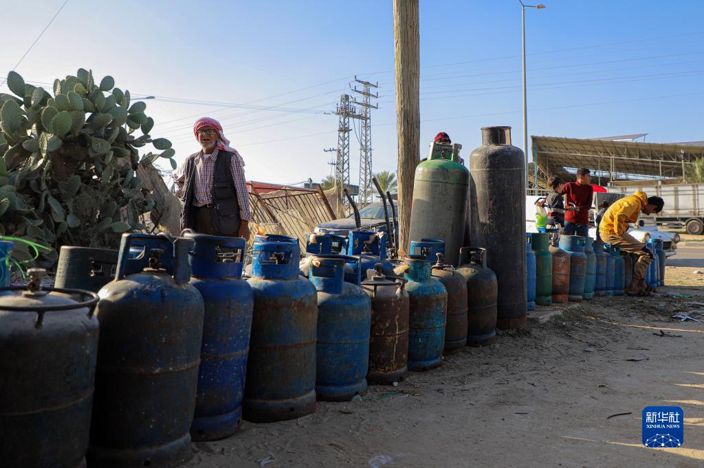 11月24日,在加沙地帶南部城市拉法,人們排隊等待充天然氣。