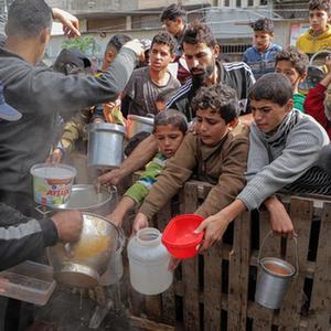 11月19日,在加沙地帶南部城市拉法,人們領取救濟食物。