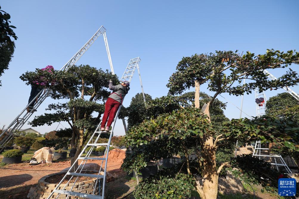 11月25日,在金華市金東區澧浦花木城的苗圃內,工作人員在修剪茶樹。