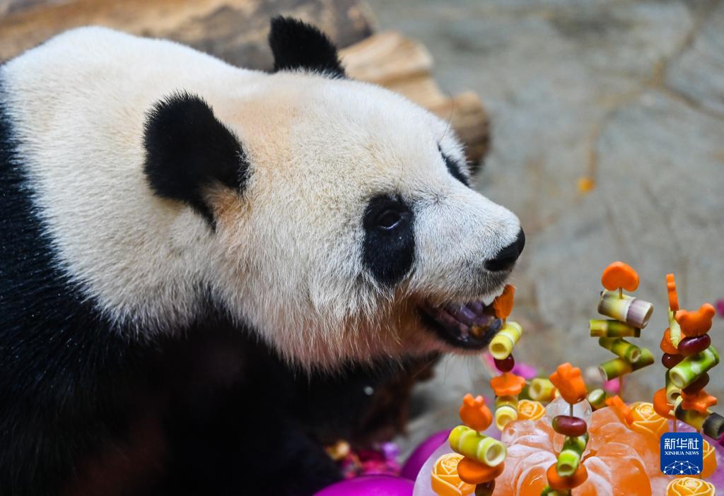 當日,為慶祝大熊貓“貢貢”和“舜舜”來到海南五周年,位于??诘暮D蠠釒б吧鷦又参飯@為這對“熊貓兄弟”準備了玩具和竹筍、水果等美食,同時舉辦多種科普活動和互動游戲,吸引不少游客參加。