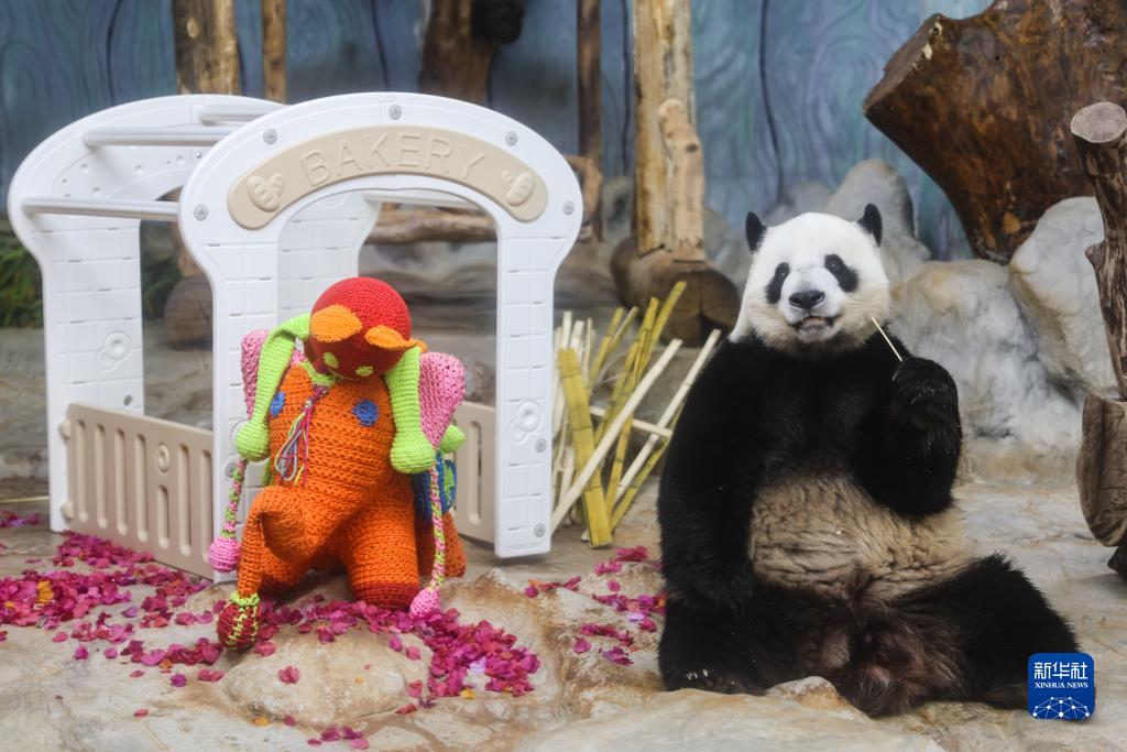 當日,為慶祝大熊貓“貢貢”和“舜舜”來到海南五周年,位于??诘暮D蠠釒б吧鷦又参飯@為這對“熊貓兄弟”準備了玩具和竹筍、水果等美食,同時舉辦多種科普活動和互動游戲,吸引不少游客參加。
