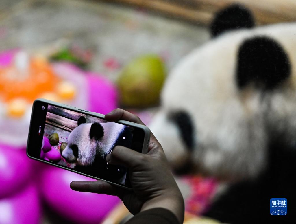當日,為慶祝大熊貓“貢貢”和“舜舜”來到海南五周年,位于??诘暮D蠠釒б吧鷦又参飯@為這對“熊貓兄弟”準備了玩具和竹筍、水果等美食,同時舉辦多種科普活動和互動游戲,吸引不少游客參加。