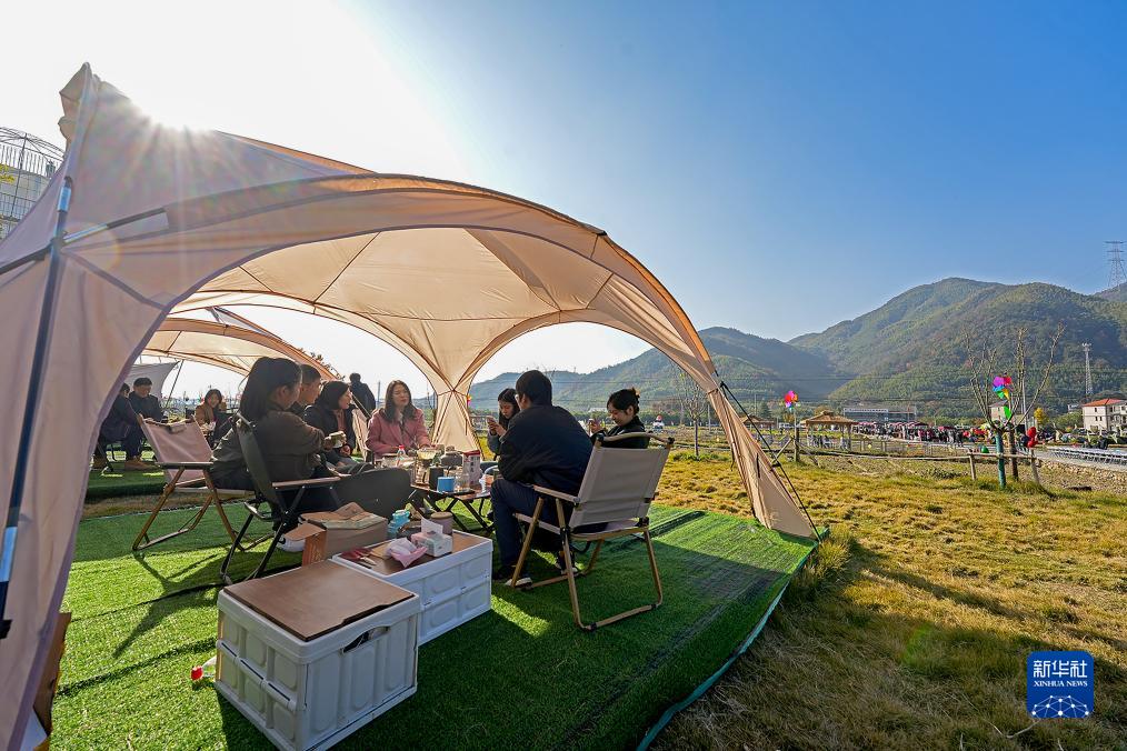 11月25日,在杭州市臨安區郎家村,游客在稻田文化節上體驗田園風光。