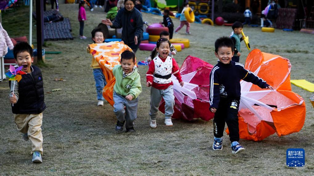 11月24日,在上海市實驗幼兒園,小朋友玩賽跑游戲。
