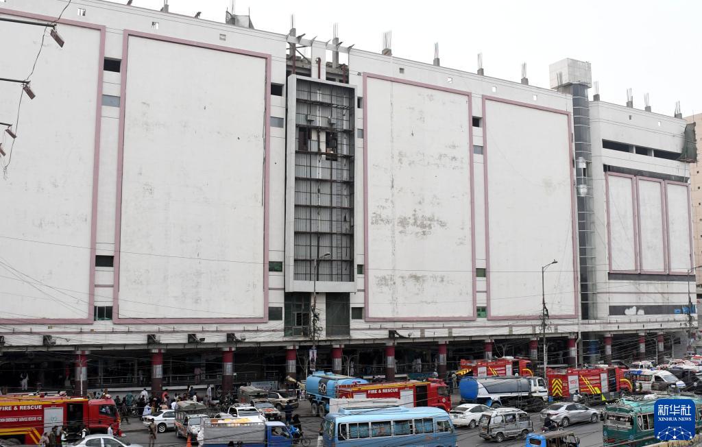 11月25日,在巴基斯坦卡拉奇,應急車輛停在發生火災的商場外。