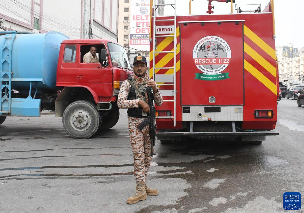 11月25日,在巴基斯坦卡拉奇,一名安全人員在發生火災的商場外警戒。