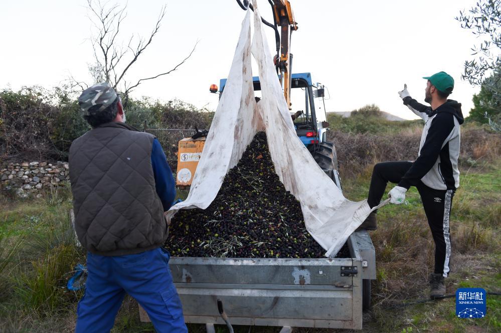 11月24日,兩名男子在西班牙卡塞雷斯的農田里收獲橄欖。