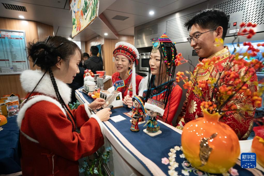 11月26日,乘坐麗香鐵路首發列車的乘客(左)向列車乘務員咨詢紀念品。