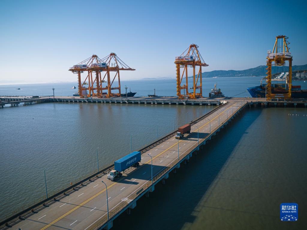 11月22日,裝載集裝箱的卡車行駛在溫州港狀元岙集裝箱碼頭內(無人機照片)。