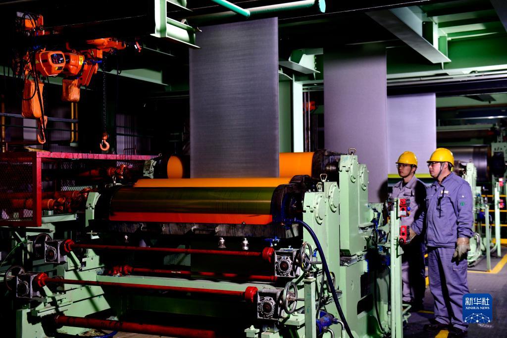 11月26日,在山東新美達科技材料有限公司,工人在鍍鋅板生產流水線工作。