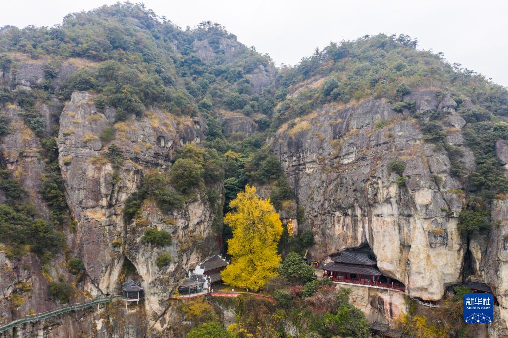 初冬時節,浙江省建德市大慈巖懸空寺前的古銀杏樹披上“黃金甲”,漫天飛舞的銀杏“雨”,構成一幅絕美的圖景,成為當地鄉村旅游的網紅打卡地。這棵古銀杏樹樹高39.5米,胸徑1.3米,曾入選“杭州十大最美古樹名木”,樹齡已有700多年,是建德的銀杏之王。