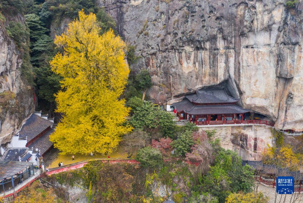 初冬時節,浙江省建德市大慈巖懸空寺前的古銀杏樹披上“黃金甲”,漫天飛舞的銀杏“雨”,構成一幅絕美的圖景,成為當地鄉村旅游的網紅打卡地。這棵古銀杏樹樹高39.5米,胸徑1.3米,曾入選“杭州十大最美古樹名木”,樹齡已有700多年,是建德的銀杏之王。