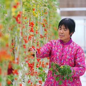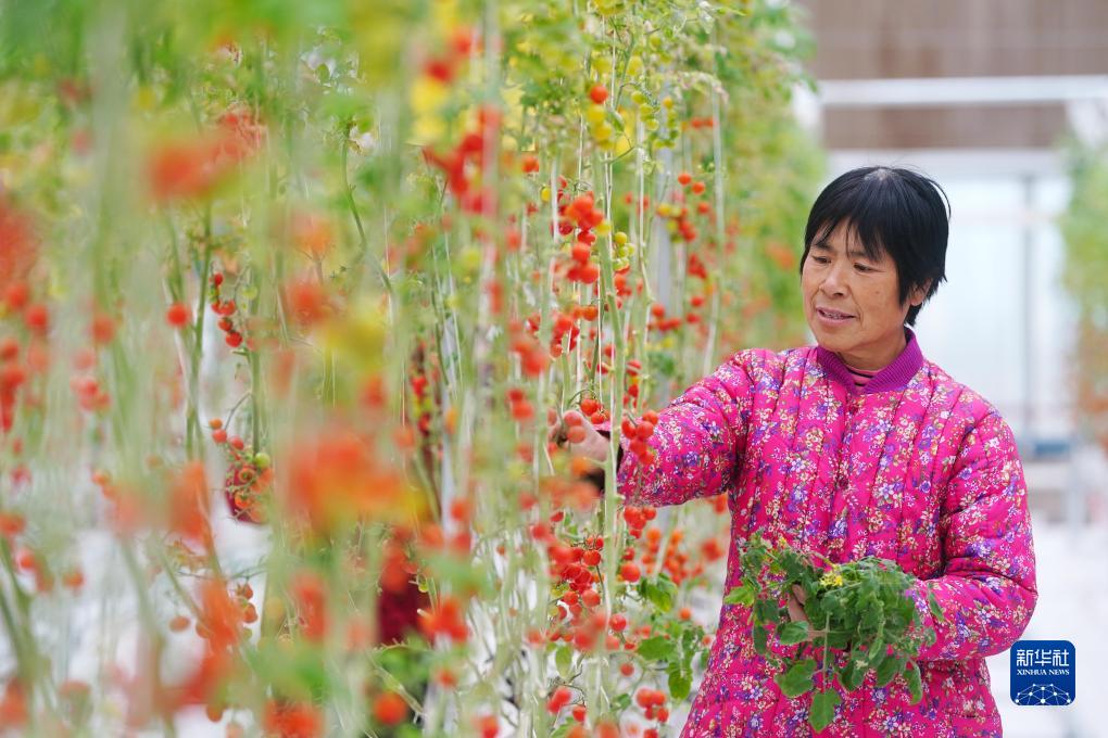 在平山縣滹沱河高端設施蔬菜示范區育苗中心,大吾鄉田興村村民安鳳翠管護小番茄(11月25日攝)。