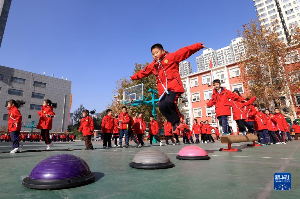 11月27日,河北省石家莊市翟營大街小學學生在大課間進行“平衡球跳躍”游戲。