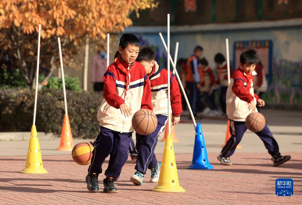 11月27日,河北省石家莊市仁華小學學生利用大課間進行籃球繞樁練習。