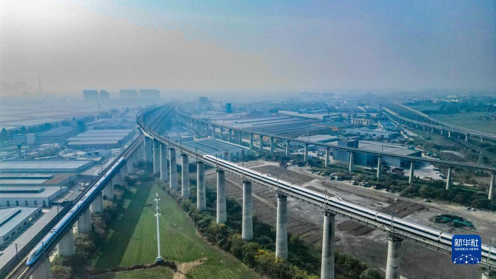 11月28日,在成都市青白江區境內拍攝的行駛在川青鐵路上的列車(上)和行駛在西成高鐵線上的列車(下)(無人機照片)。