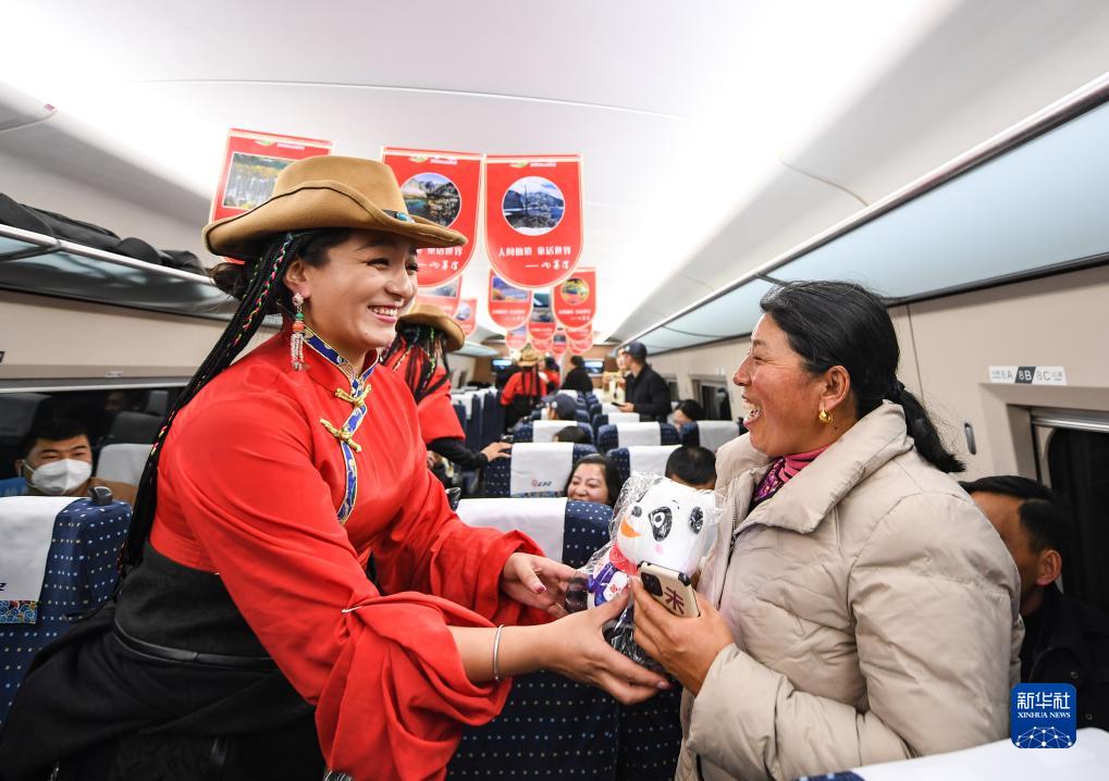 11月28日,在C6008次首發列車上,來自阿壩州民族歌舞團的演員給乘客贈送紀念品。