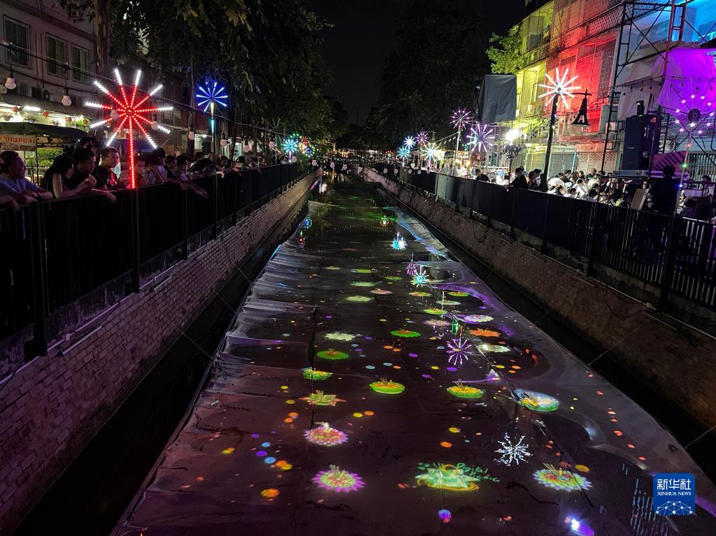 11月27日,色彩斑瀾的數字水燈投影到曼谷老城區翁昂運河上。