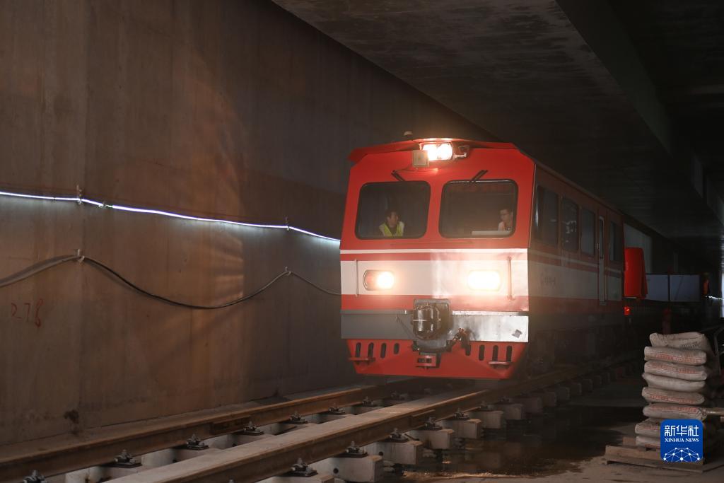 11月28日,在杭州至德清市域鐵路上,工程技術人員操作軌道車進行鋪軌作業。