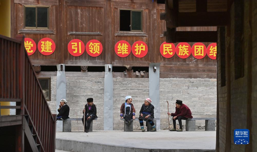 在烏英苗寨,老人們在窗外的小廣場上曬太陽(2023年3月15日攝)。