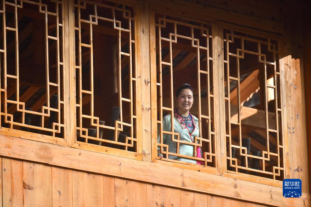 一名烏英苗寨村民從風雨樓里看窗外的風景(2023年10月4日攝)。