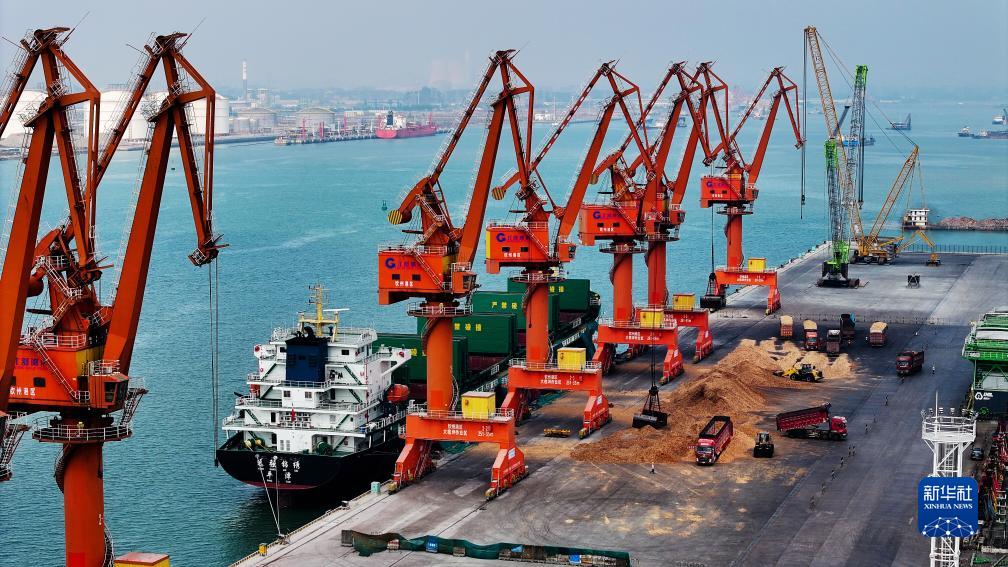 一艘貨輪在廣西欽州港西港區碼頭下卸貨物(11月24日攝,無人機照片)。