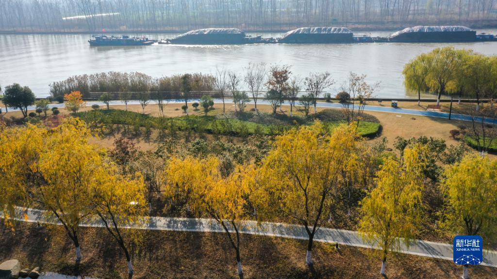 江蘇省宿遷市泗陽縣京杭大運河岸線層林盡染(11月28日攝,無人機照片)。