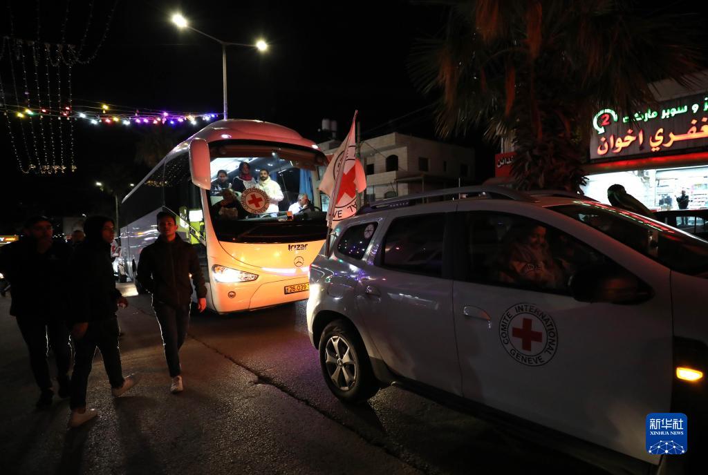 11月28日晚,載有獲釋巴勒斯坦被關押人員的大巴抵達約旦河西岸城市拉姆安拉。