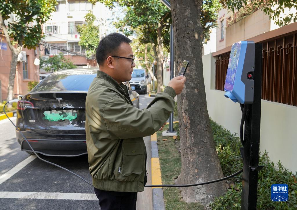 11月29日,在上海市徐匯區田林十三村小區內,居民通過手機掃碼,使用充電樁為新能源車充電。