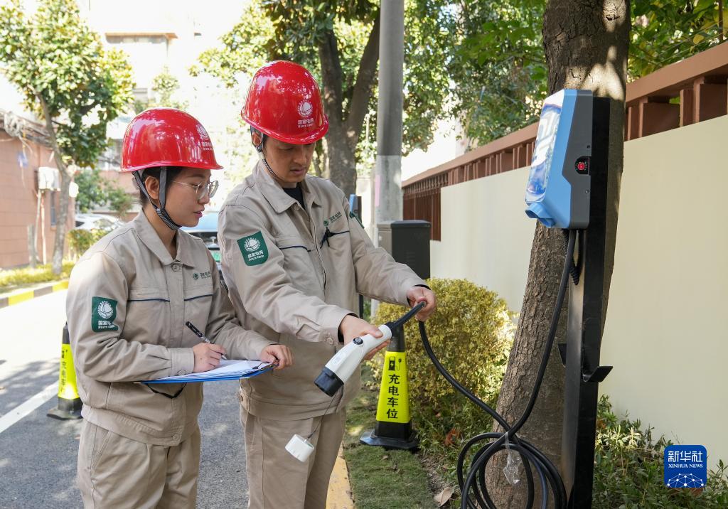 11月29日,在上海市徐匯區田林十三村小區內,國網上海市南供電公司的工作人員在檢查充電樁運行情況。