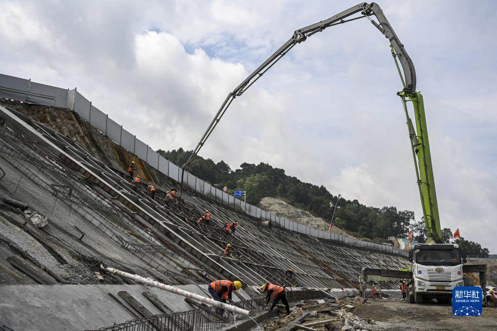 工人在平陸運河馬道樞紐建設現場加固邊坡(7月1日攝)。