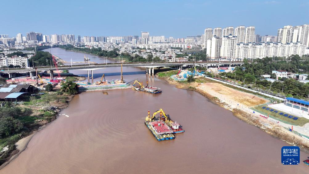施工船在平陸運河途徑欽州市區的航道建設現場作業(11月25日攝,無人機照片)。
