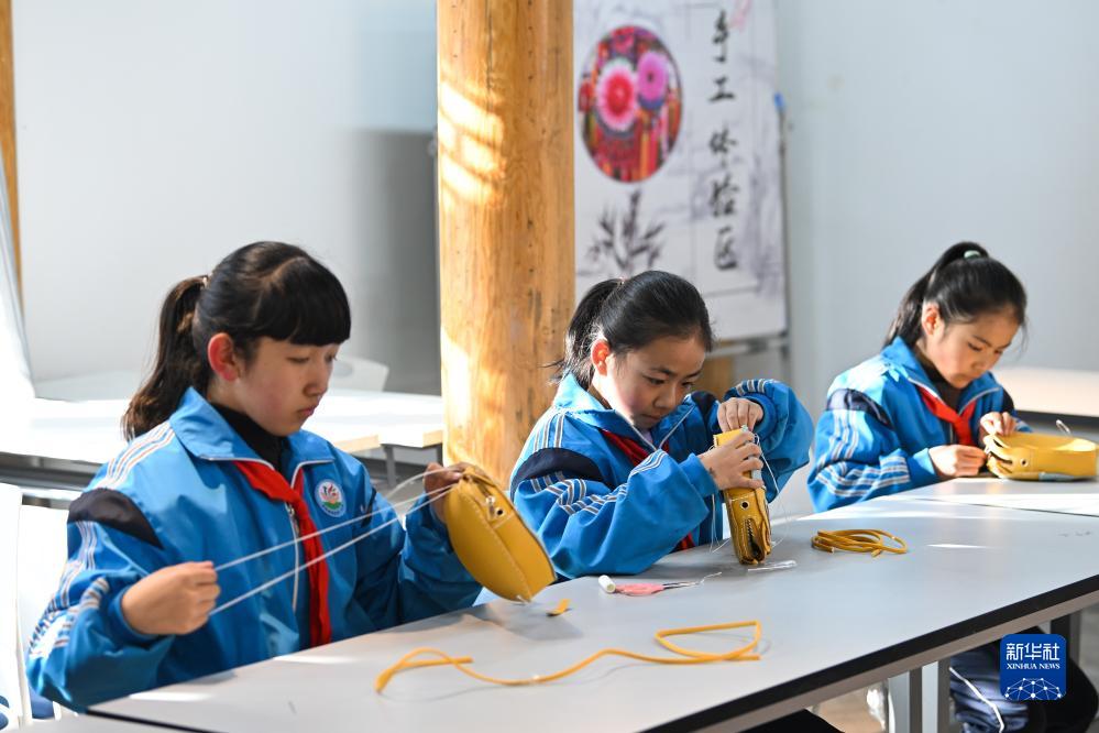 11月29日,在青海省西寧市湟源縣城關第一小學,學生在非遺文化課程中體驗皮繡。