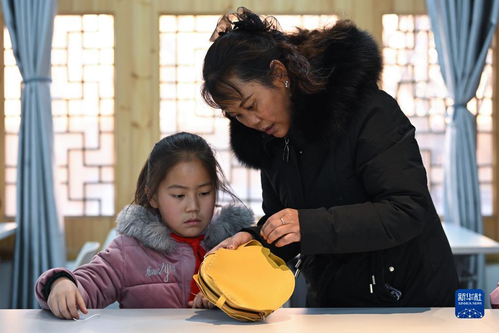 11月29日,在青海省西寧市湟源縣城關第一小學,非遺傳承人樊國敏(右)在指導學生做皮繡。