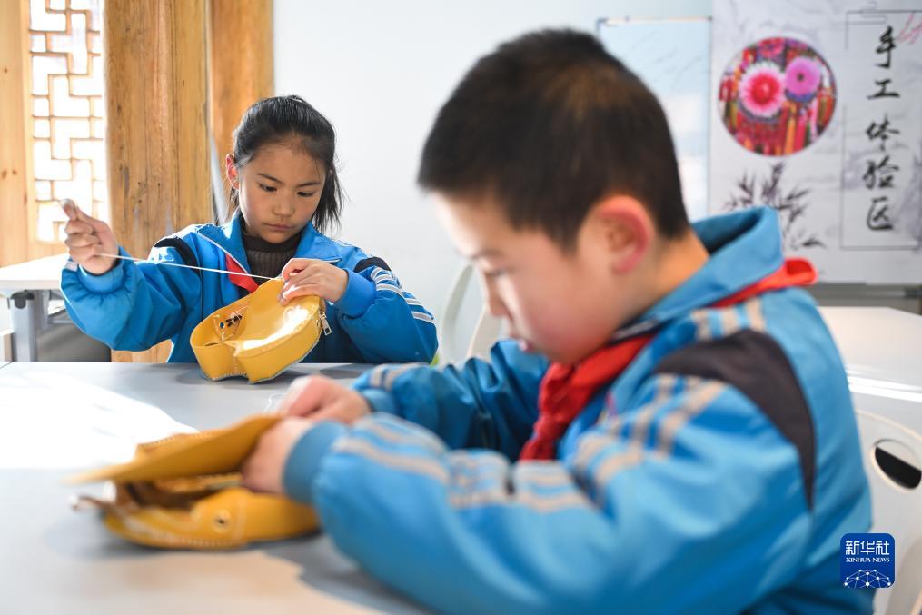 11月29日,在青海省西寧市湟源縣城關第一小學,學生在非遺文化課程中體驗皮繡。