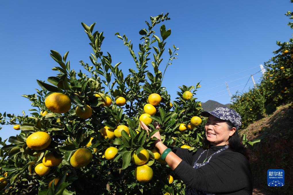 11月28日,在位于浙江省麗水市慶元縣黃壇村的外婆家水果專業合作社甜桔柚基地內,果農在采摘成熟的甜桔柚。