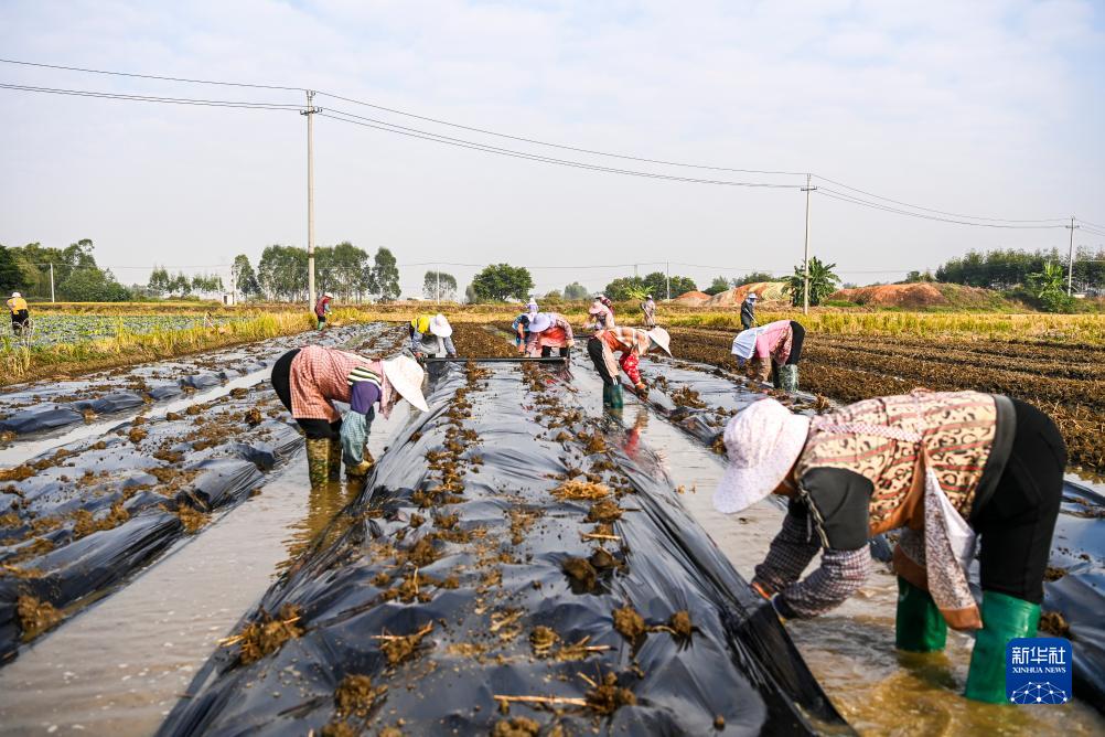 11月29日,在廣西貴港市港北區,村民鋪設種植蔬菜使用的地膜。