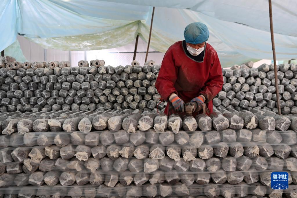 11月29日,在后官寨鎮司官寨村食用菌基地,工作人員進行菌棒接種作業。