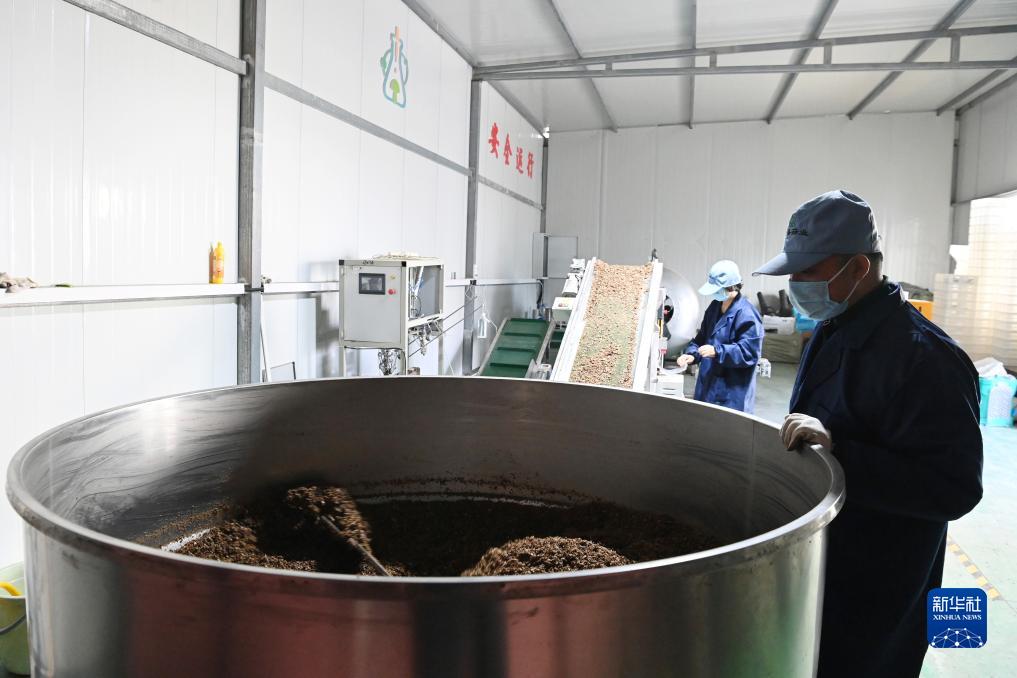 11月29日,在后官寨鎮司官寨村食用菌基地,工作人員查看菌種原料。