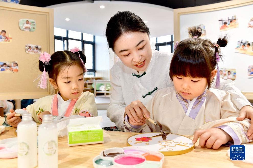 11月29日,在濟南市七里山幼教集團山望幼兒園景泰藍手工坊,陳文君老師教孩子們做手工。
