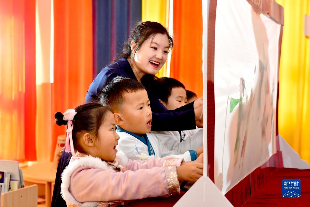 11月29日,在濟南市七里山幼教集團山望幼兒園皮影手工坊,朱慶敏老師教孩子們表演皮影戲。
