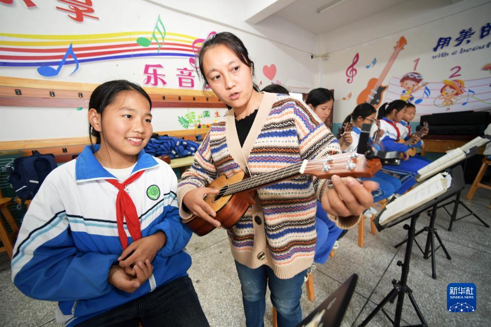 11月29日,學生在貴州省遵義市正安縣第二完全小學音樂室學彈樂器。