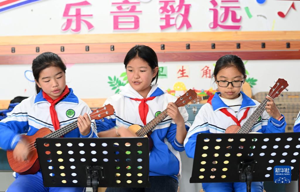 11月29日,學生在貴州省遵義市正安縣第二完全小學音樂室學彈樂器。