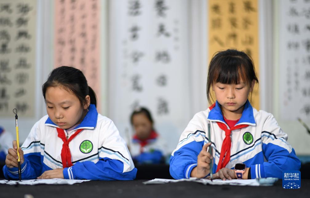 11月29日,學生在貴州省遵義市正安縣第二完全小學書畫室學習書法。