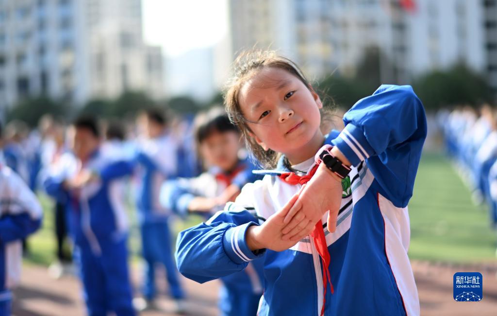 11月29日,學生在貴州省遵義市正安縣第二完全小學做課間操。