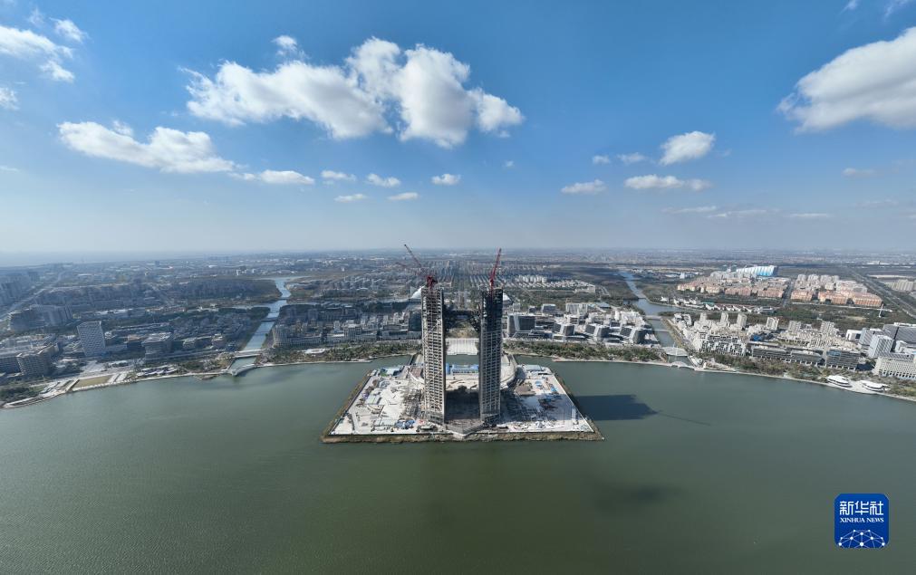 這是鋼結構錐體提升完成的西島中銀金融中心項目南北塔樓(11月24日攝,無人機照片)。