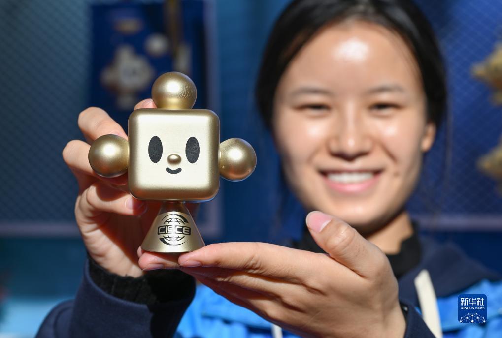 11月29日,在鏈博會文創小店服務的志愿者向記者展示 “鏈氪”玩具手辦。