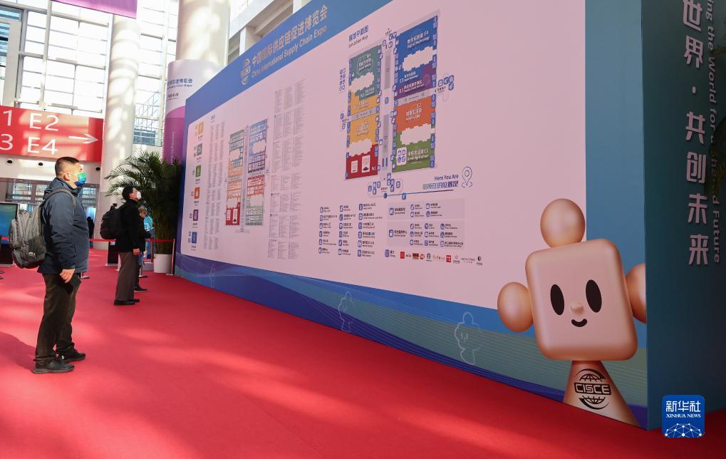 11月29日,鏈博會會場入口處的地圖導引墻上印有吉祥物“鏈氪”的形象。