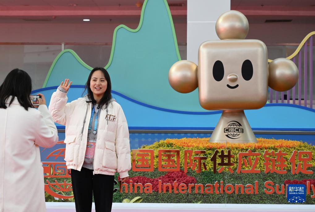 11月29日,參觀者在擺放著“鏈氪”標識的花壇前留影。