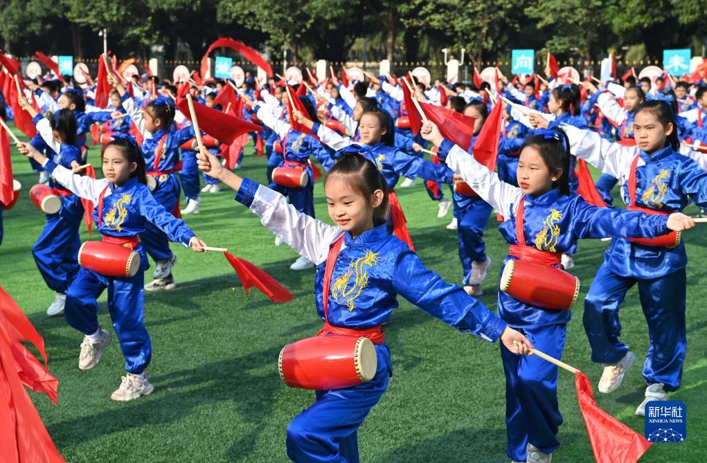 當日,廣西南寧市濱湖路小學舉行主題為“逐夢新時代 健體向未來”的體育文化節。開幕式上,孩子們表演民族歌舞,跳腰鼓舞,展示陽光運動團體操,共度歡樂時光。